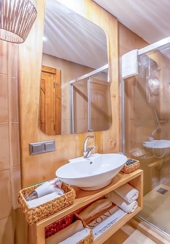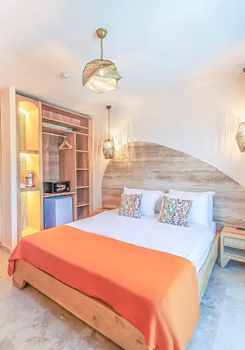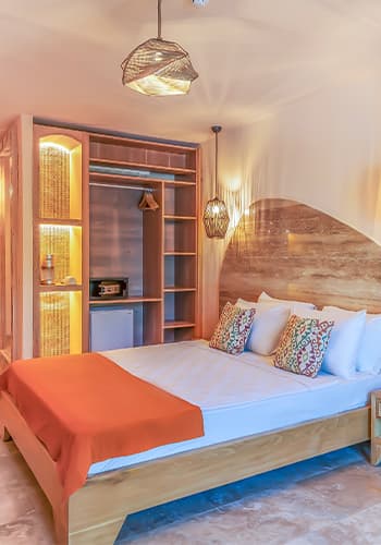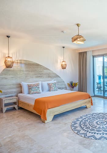 Our sea view deluxe rooms are a perfect choice for guests who want to enjoy the magnificent view of the turquoise sea, elegantly designed with a large bed, a comfortable sofa, and a work desk.